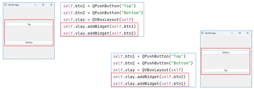 - addWidget() , addLayout() 등 코드 작성 순서가 GUI 화면의 배치 순서로 결정된다.