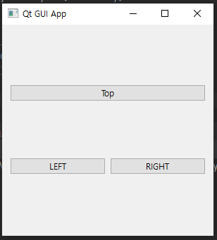 #수직 배치, 수평 배치 레이아웃을 같이 사용한 샘플코드 #디자인을 보고, 어떤 레이아웃을 사용할 지 결정하고 사용해야 한다. #QHBoxLayout : 수평배치 레이아웃 생성 #.addLayout() : 레이아웃을 추가하는 API from PySide6.QtWidgets import * class MyApp(QWidget): def __init__(self): super().__init__() self.main() def main(self): self.setWindowTitle("Qt GUI App") self.setGeometry(0, 0, 300, 300) #버튼 3개 생성 self.btn1 = QPushButton("Top") self.btn2 = QPushButton("LEFT") self.btn3 = QPushButton("RIGHT") #수직배치, 수평배치 레이아웃 생성 self.vlay = QVBoxLayout(self) self.hlay = QHBoxLayout(self) #수직배치 레이아웃에 btn1 추가 self.vlay.addWidget(self.btn1) #수평배치 레이아웃에 btn2, btn3 추가 self.hlay.addWidget(self.btn2) self.hlay.addWidget(self.btn3) #수직배치 레이아웃에 수평배치 레이아웃 self.vlay.addLayout(self.hlay) if __name__ == '__main__': app = QApplication() win = MyApp() win.show() app.exec()▶ 수직 레이아웃 객체 생성