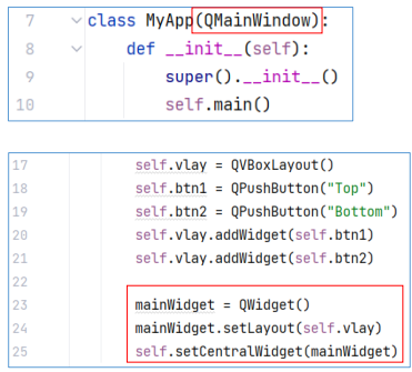 class MyApp(QWidget): def __init__(self): super().__init__() self.main() def main(self): self.setWindowTitle("Qt GUI App") self.setGeometry(0, 0, 300, 300) self.vlay = QVBoxLayout(self) self.btn1 = QPushButton("Top") self.btn2 = QPushButton("Bottom") self.vlay.addWidget(self.btn1) self.vlay.addWidget(self.btn2)self.vlay = QVBoxLayout(self)