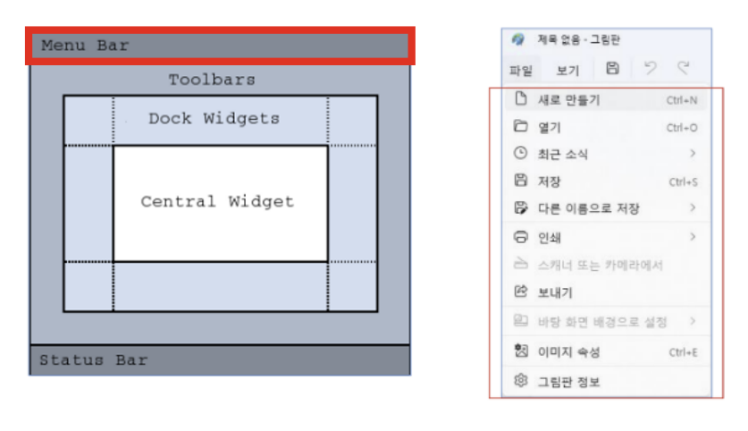 # menuBar객체 menu 생성, menuBar() 는 QMainWindow 에 멤버함수 self.menu = self.menuBar() # menuBar 에 File 메뉴 추가, &를 붙이면 단축키 사용이 가능하다. Alt+F self.menuFile = self.menu.addMenu("&File") # menuBar 에 Edit 메뉴 추가, &를 붙이면 단축키 사용이 가능하다. Alt+E self.menuEdit = self.menu.addMenu("&Edit") ``` QAction 객체 생성 ``` # menuFile 에 openAction 객체 등록, File 메뉴 클릭 시, Open 메뉴 창이 나타난다. self.menuFile.addAction(self.openAction)copy▶ 메뉴바 객체 생성