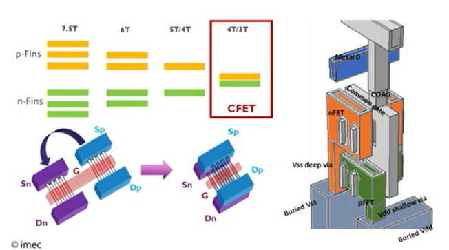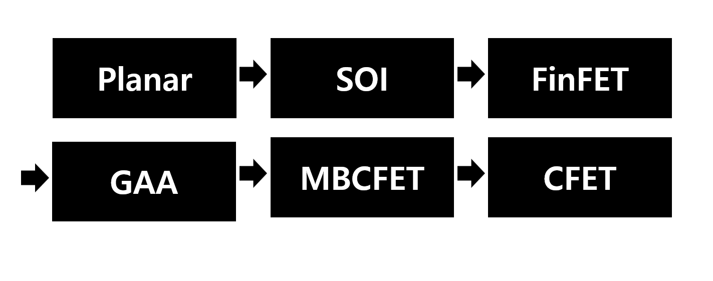 - CFET은 P형 및 N형 트랜지스터를 서로 위아래로 적층하여 공간 효율성을 극대화한 구조