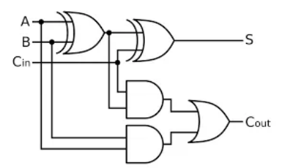 module full_adder ( input a, // 입력 A (1비트) input b, // 입력 B (1비트) input cin, // 입력 캐리 output sum, // 출력 합계 output cout // 출력 캐리 ); wire axb, axb_cin, ab; // 중간 신호 // 합계 (Sum) 계산 xor (axb, a, b); // axb = a ^ b xor (sum, axb, cin); // sum = (a ^ b) ^ cin // 캐리 (Carry) 계산 and (axb_cin, axb, cin); // axb_cin = (a ^ b) & cin and (ab, a, b); // ab = a & b or (cout, ab, axb_cin); // cout = (a & b) | ((a ^ b) & cin) endmodule