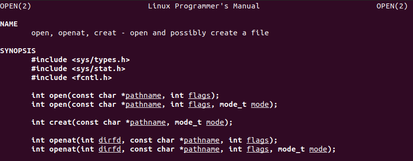 ex) open() Syscall에 대한 interface, header file을 보고 싶다면, $ man 2 open